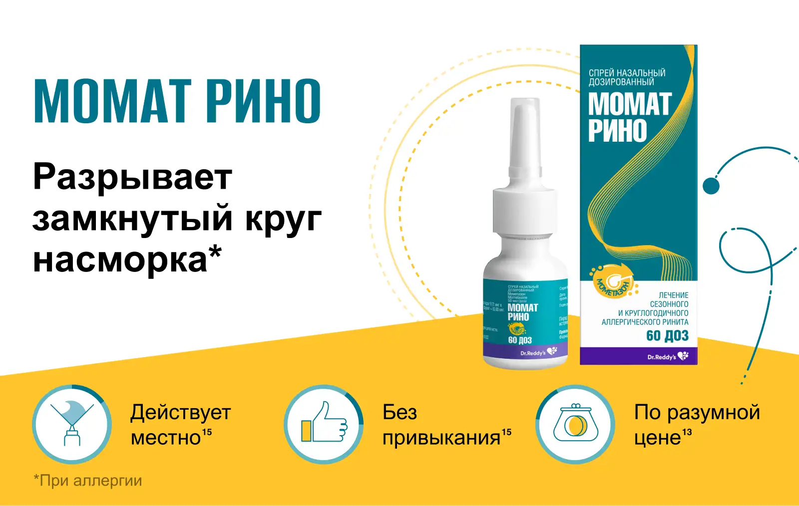 Примеры таких комбинаций: Момат Рино и Цетрин® (ИнГКС + оральный АГП), а также Момат Рино Адванс (ИнГКС + интраназальный АГП).