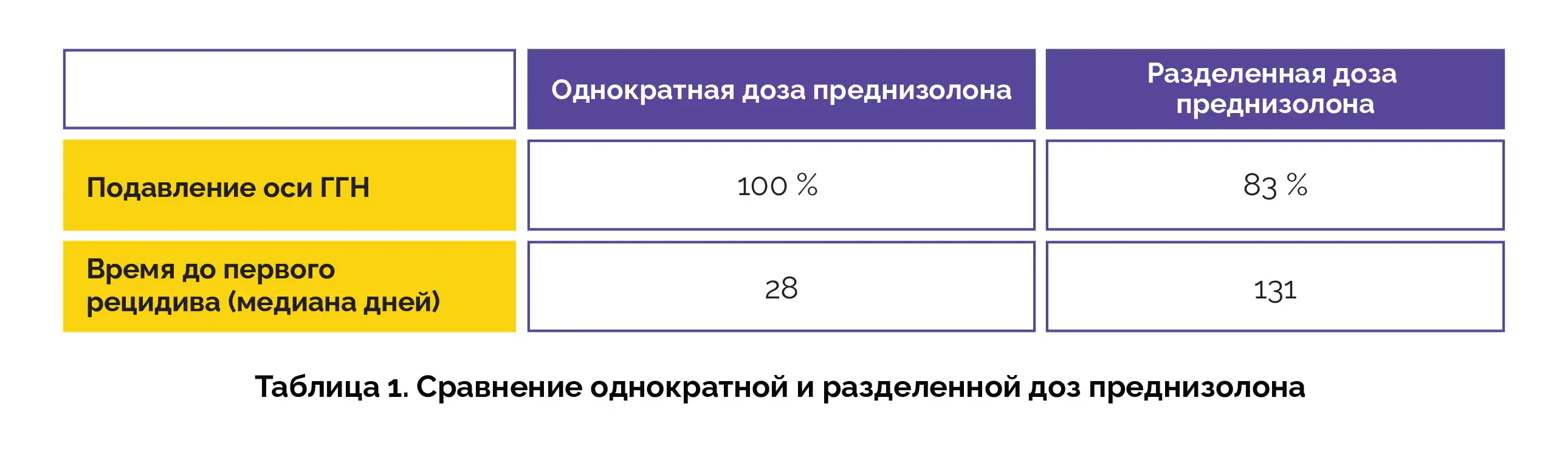 В то время как обе схемы дозирования эффективно вызывали ремиссию, разделенная доза преднизолона приводила к большему подавлению оси ГГН. Однако у детей, получавших разделенные дозы, наблюдалось более короткое время до первого рецидива (таблица 1).