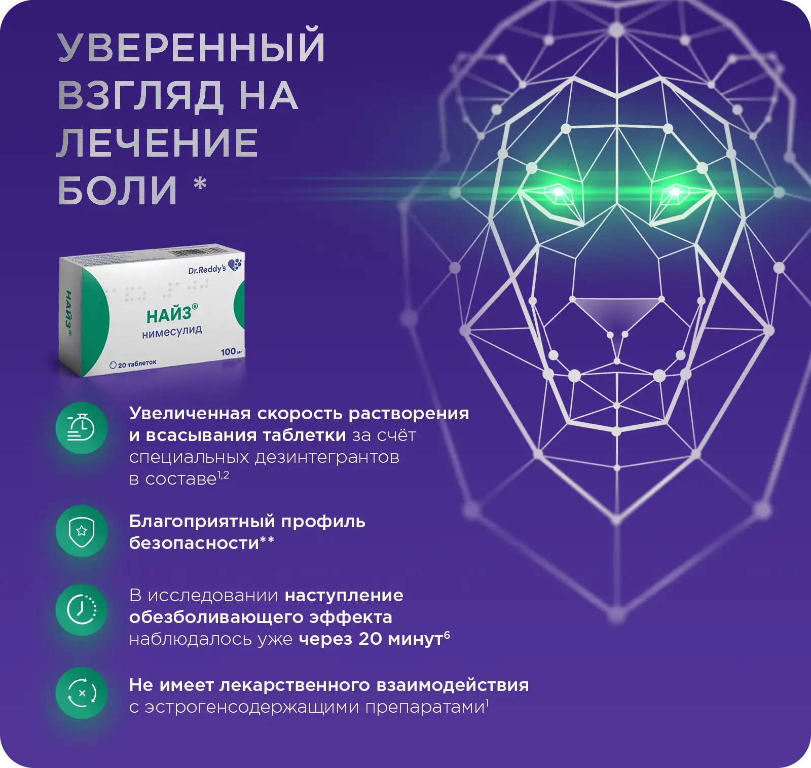 * Найз® 100 мг зарегистрирован в РФ 19.08.1998г. РУ NoП N 012824/03 и является лидером по продажам в упаковках среди нимесулидов для перорального приема, IQVIA январь-октябрь 2023, Россия; H.G. Kress, A. Baltov, A. Basiński, F. Berghea, J. Castellsague, C. Codreanu, E. Copaciu, M.A. Giamberardino, M. Hakl, L. Hrazdira, M. Kokavec, J. Lejčko, L. Nachtnebl, R. Stančík, A. Švec, T. Tóth, M.V. Vlaskovska и J. Woroń (2016). Acute pain: a multifaceted challenge - the role of nimesulide. Current Medical Research and Opinion, 2016, 32(1), 23-36. DOI: 10.1185/03007995.2015.1100986.