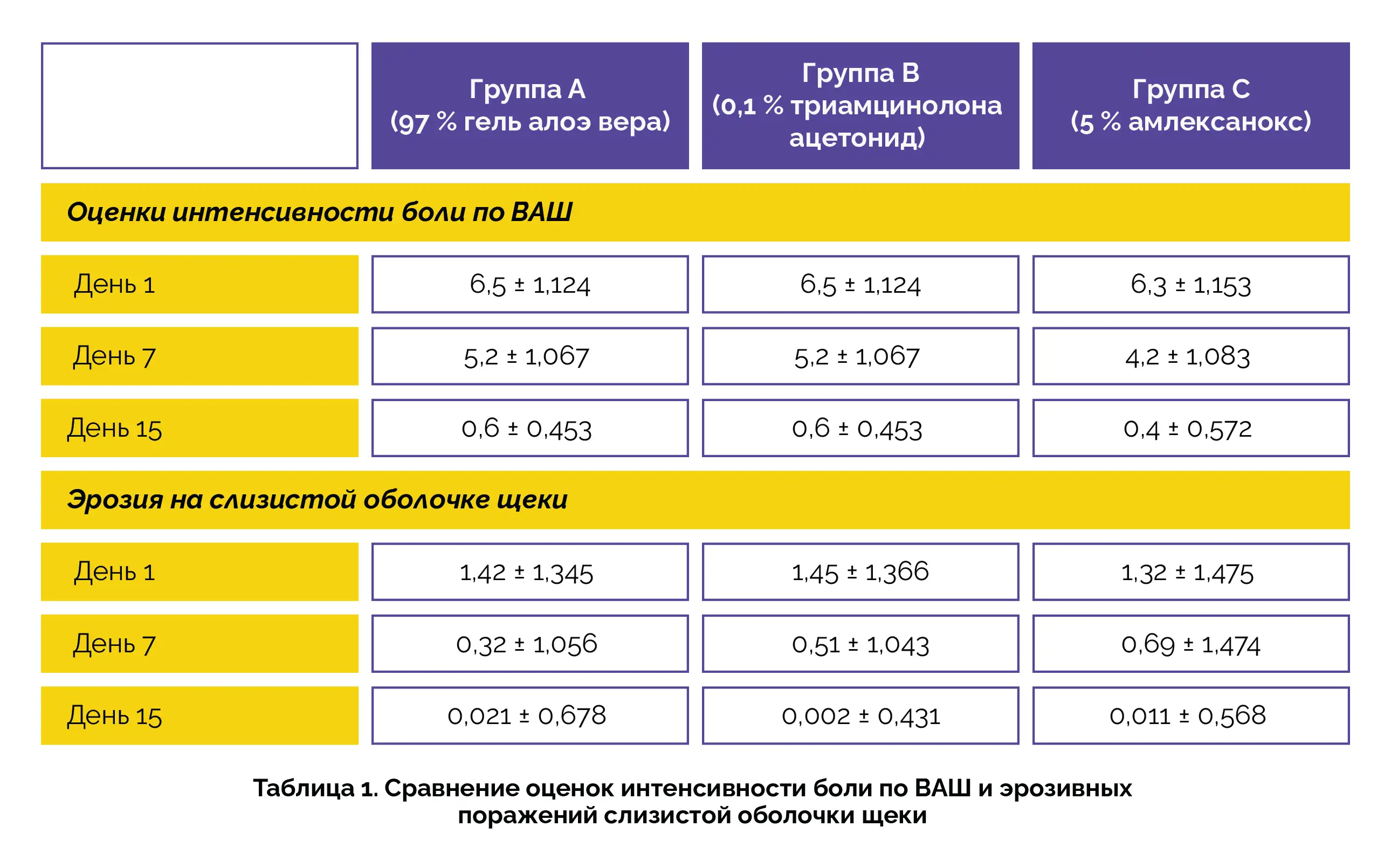 Пациентам дали указания наносить назначенный препарат на пораженные участки три раза в сутки (после еды) в течение 15 дней. Уровень боли оценивали по визуальной аналоговой шкале (ВАШ); тип язвенного поражения и площадь эрозий оценивали на 1, 7 и 15-й дни исследования. Статистический анализ данных выполняли с использованием U-критерия Манна — Уитни с уровнем значимости p < 0,05.