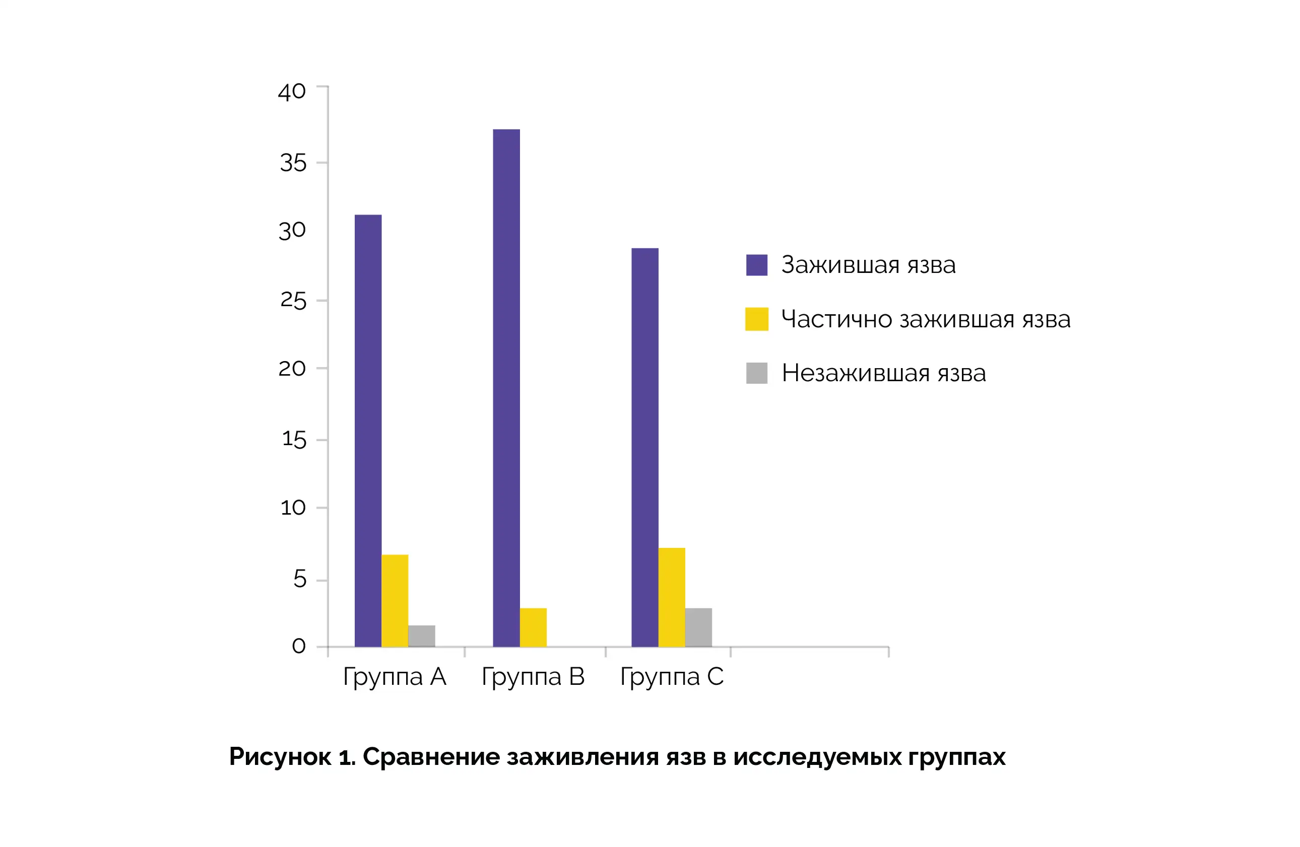 При применении всех трех исследуемых препаратов с 1-го по 15-й дни наблюдалось выраженное снижение оценок интенсивности боли по ВАШ, уменьшение площади эрозий на слизистой оболочке щеки и улучшение заживления язв (таблица 1 и рисунок 1).