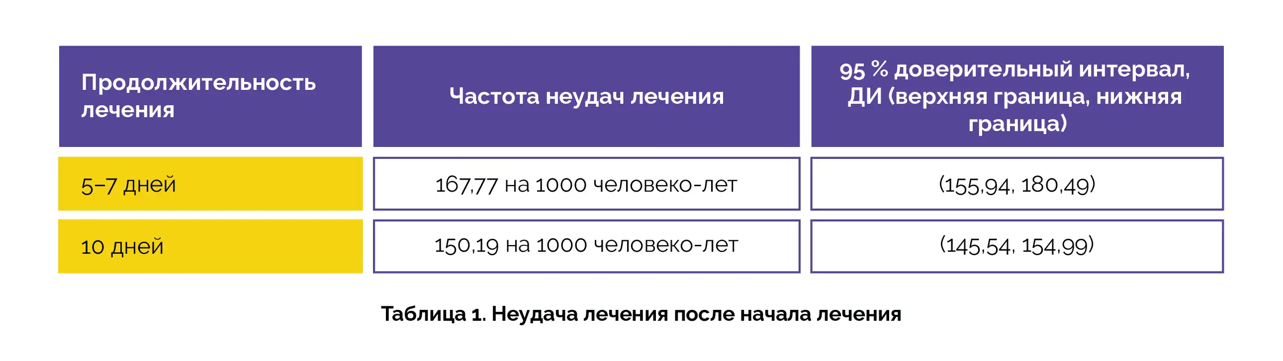 среди пациентов, получавших лечение в течение 5–7 дней, и среди пациентов, получавших лечение в течение 10 дней (отношение рисков 1,12 (95 % ДИ 1,03, 1,21)), представлена ниже (таблица 1).