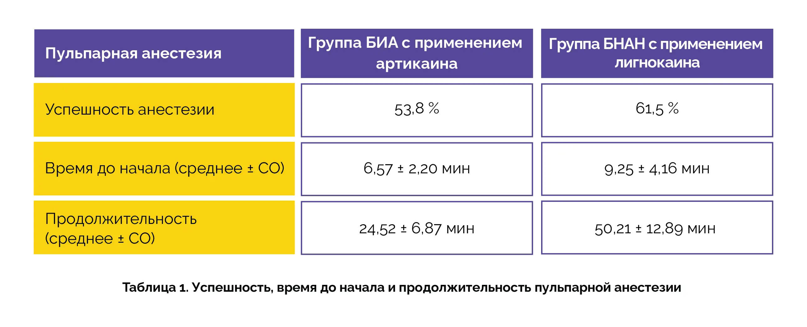 Статистически значимые различия между группами в отношении успешности пульпарной анестезии и времени до ее начала. С другой стороны, продолжительность пульпарной анестезии в группе БИА с применением артикаина была существенно ниже, чем в группе БНАН с применением лигнокаина, как показано в таблице 1.