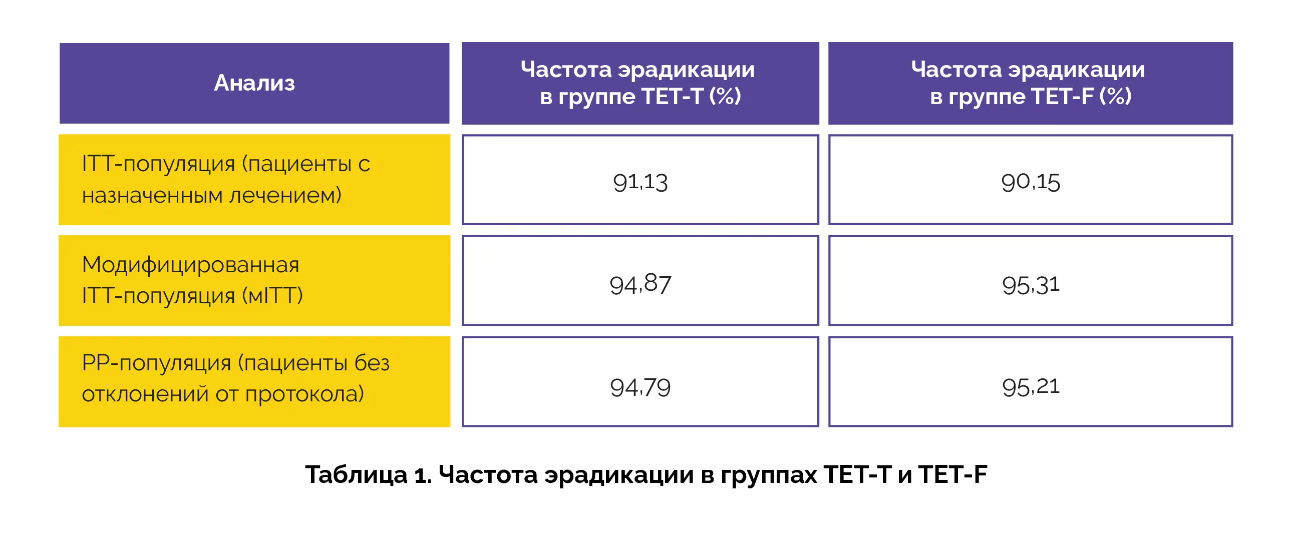 Согласно результатам анализа всех типов популяций (ITT, мITT и PP), в группе TET-T частота эрадикации была сопоставима с группой TET-F, что свидетельствует о сходной эффективности в эрадикации инфекции (см. таблицу 1).