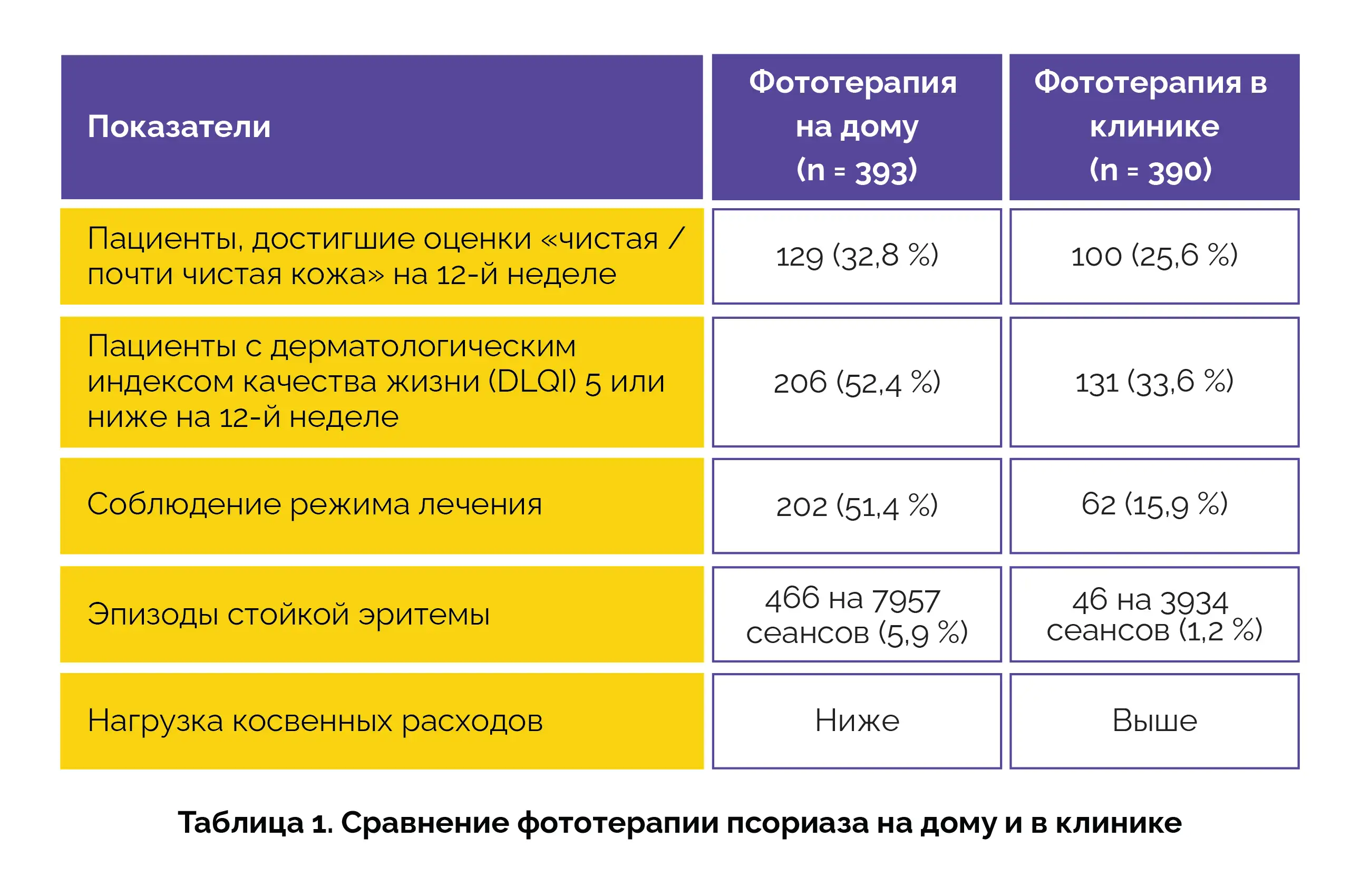 На 12-й неделе фототерапия на дому и в клинике привела к повышению чистоты кожи и качества жизни, при этом эффективность фототерапии на дому была аналогична лечению в клинике. Фототерапия на дому была связана с лучшим соблюдением режима лечения, большим количеством эпизодов стойкой эритемы и снижением финансовой нагрузки (см. таблицу 1).