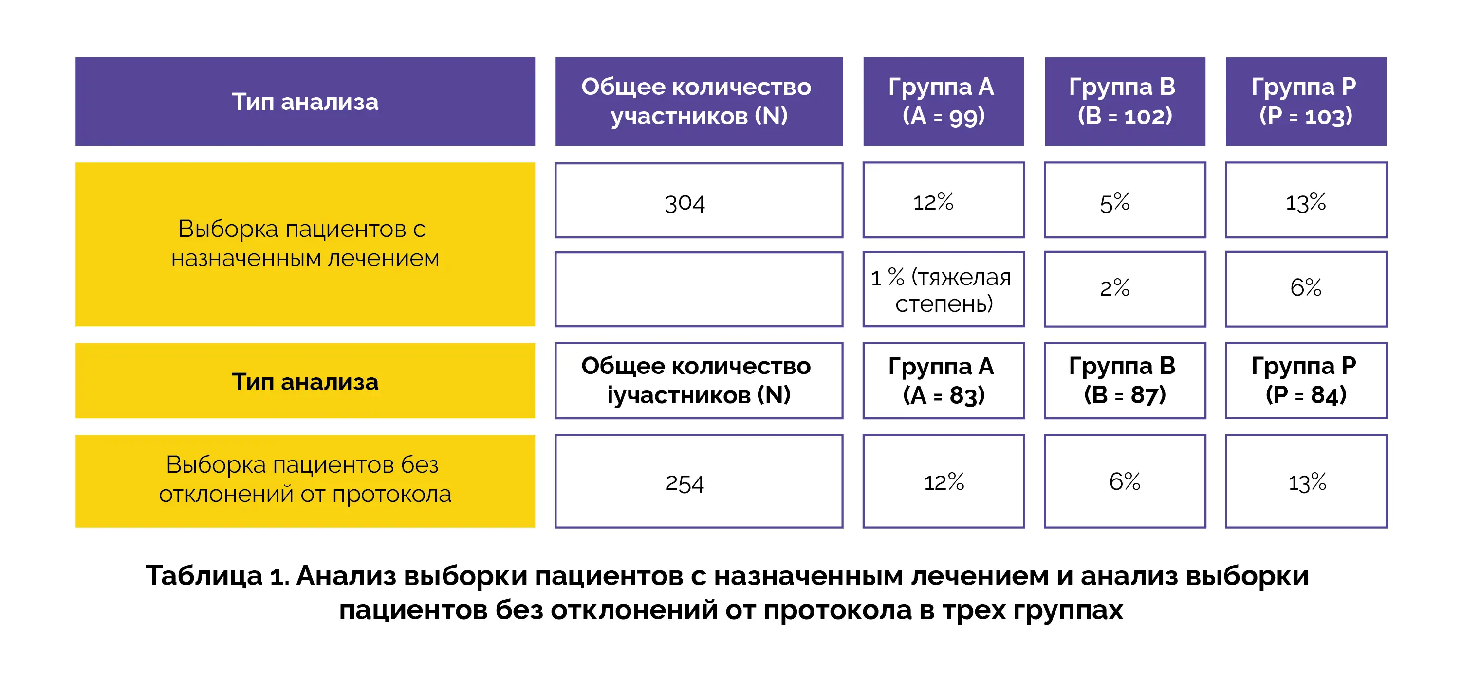 Из общего количества включенных участников 139 не удалось перевезти по воздуху из-за логистических ограничений, в результате чего в последующее наблюдение на уровне HA были включены 304 участника. Из них 254 участника выполнили протокол восхождения. Распространенность горной болезни в различных группах согласно результатам анализа выборки пациентов с назначенным лечением и выборки пациентов без отклонений от протокола представлена в таблице 1:
