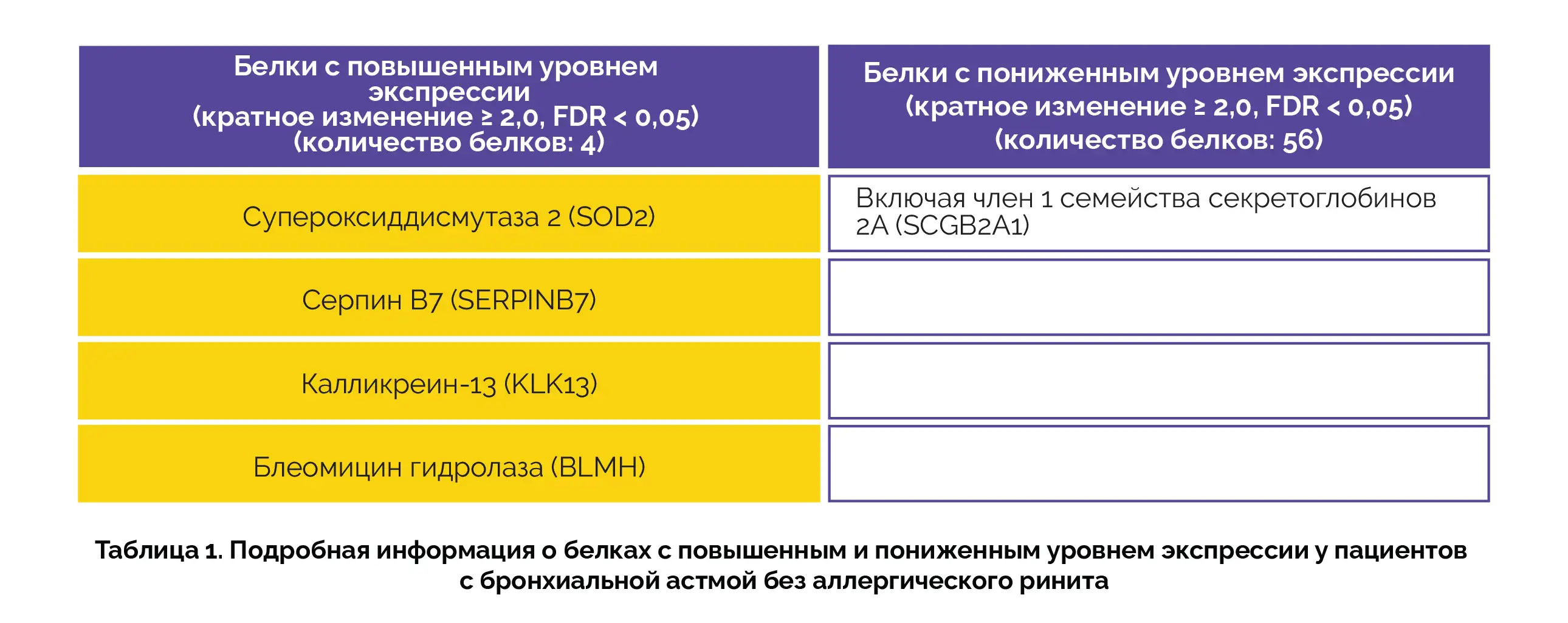 В исследование были включены 24 пациента с бронхиальной астмой, 27 пациентов с бронхиальной астмой и аллергическим ринитом, 25 пациентов с аллергическим ринитом и 12 здоровых добровольцев. После протеомного анализа в жидкости назального лаважа у пациентов с бронхиальной астмой без аллергического ринита было выявлено существенное повышение активности 4 белков по сравнению со здоровыми добровольцами. При этом экспрессия 56 белков была предположительно понижена (кратное изменение ≥ 2,0, частота ложноположительных результатов (FDR) < 0,05); более подробные данные приведены в таблице 1.