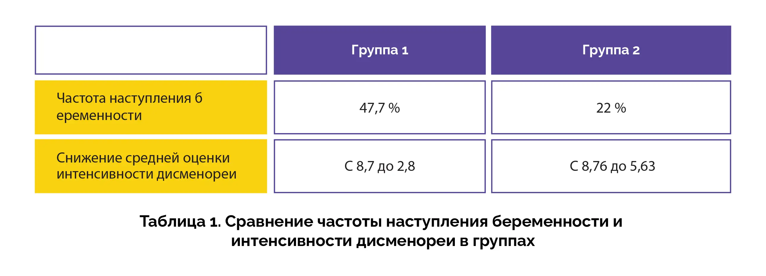 Частота наступления беременности в группе 1 была значительно выше, чем в группе 2. Кроме того, женщины в группе 1 отмечали более значительное снижение интенсивности дисменореи по сравнению с группой 2 (см. таблицу 1).