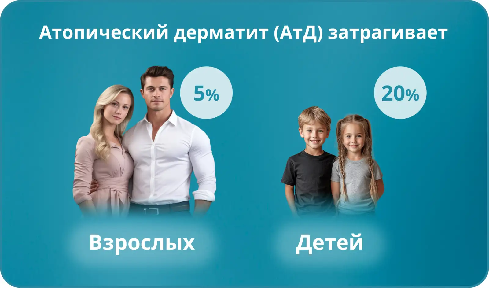 Атопический дерматит (АтД) затрагивает около 20% детей и 5% взрослых [4]. Заболевание связано с наследственной предрасположенностью и нарушением барьерной функции кожи, что увеличивает ее проницаемость для аллергенов и способствует гиперергическим реакциям организма [5].