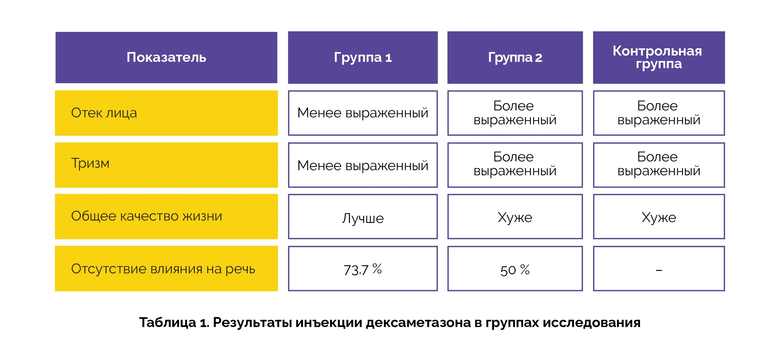 Изучаемые показатели включали выраженность отека лица после операции, ограничение открывания рта, интенсивность боли по визуальной аналоговой шкале (ВАШ) на 1-й, 3-й и 7-й дни после операции и качество жизни по шкале оценки выраженности симптомов после операции (PoSSe) на 7-й день. Основные результаты, полученные в группах исследования, были следующими: