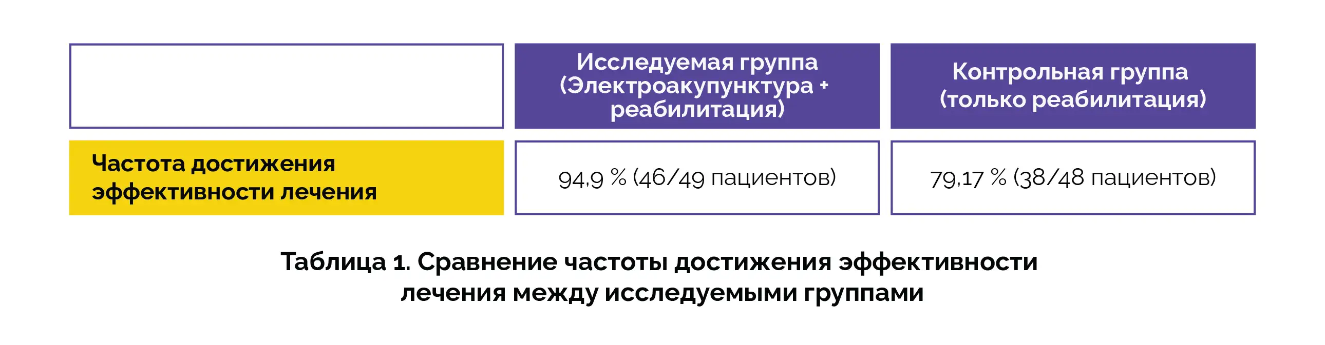 После лечения у пациентов исследуемой группы наблюдался значительно более высокий уровень эффективности по сравнению с контрольной группой (p < 0,05) (см. таблицу 1).
