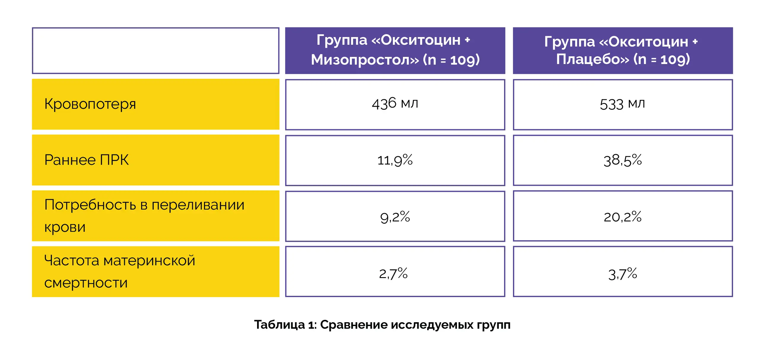 При анализе данных было отмечено, что у пациентов, получавших окситоцин + мизопростол, наблюдалась существенно меньшая кровопотеря и заметно меньшая частота возникновения раннего ПРК по сравнению с теми, кто получал окситоцин + плацебо. Потребность в переливании крови также была заметно ниже в группе «Окситоцин + Мизопростол». Тем не менее, частота материнской смертности была одинаковой в обеих группах, как показано в таблице 1: