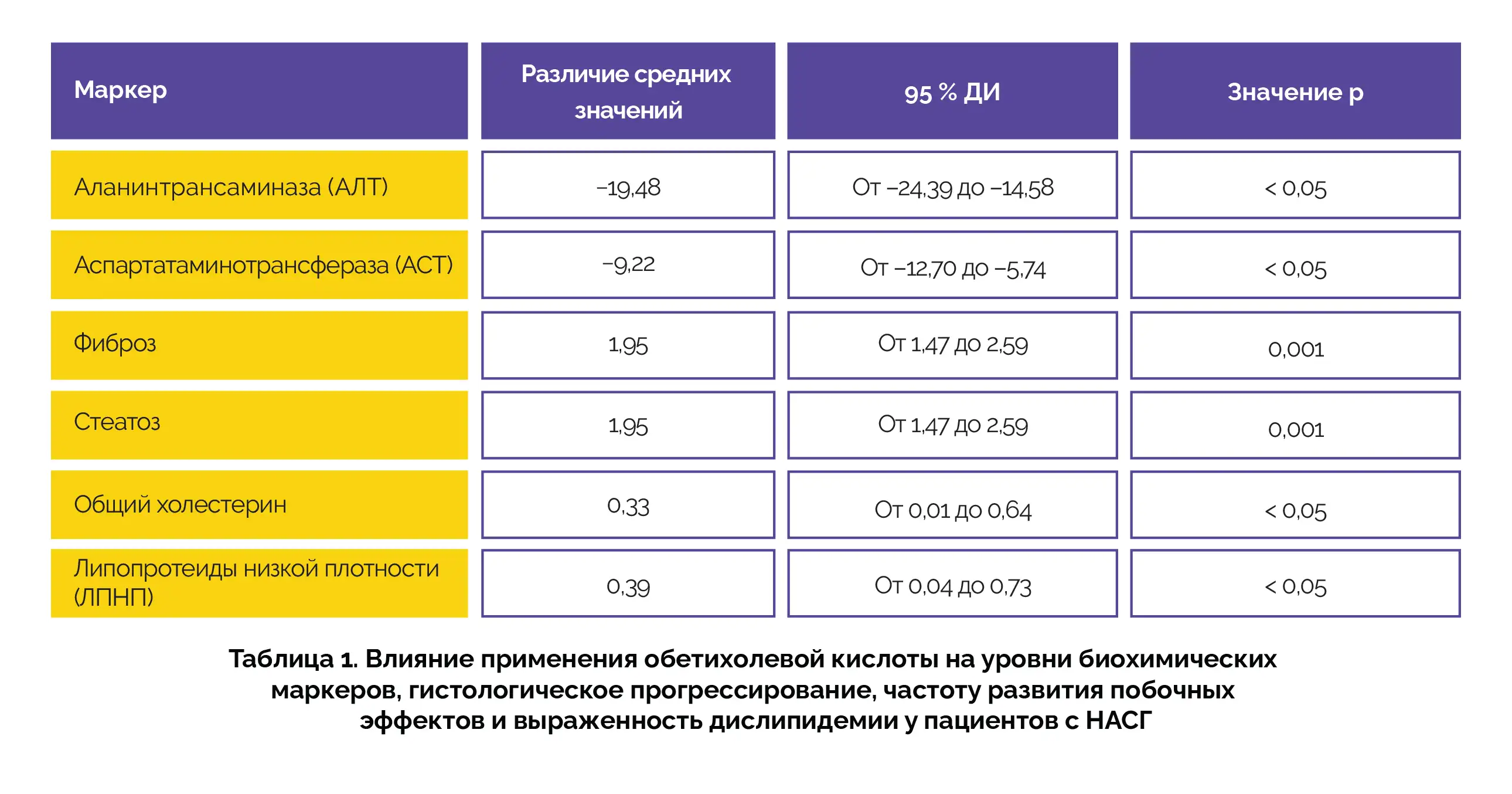 В анализ были включены 5 исследований. В отношении биохимических маркеров, у пациентов, получавших ОХК, наблюдалось выраженное повышение активности аланинтрансферазы и аспартатаминотрансферазы. С точки зрения гистологического прогрессирования терапия ОХК обеспечивала уменьшение выраженности фиброза и стеатоза. Статистически значимых различий в отношении побочных эффектов не отмечалось. С точки рения выраженности дислипидемии были выявлены статистически значимые различия в средних уровнях общего холестерина и липопротеидов низкой плотности (см. таблицу 1).