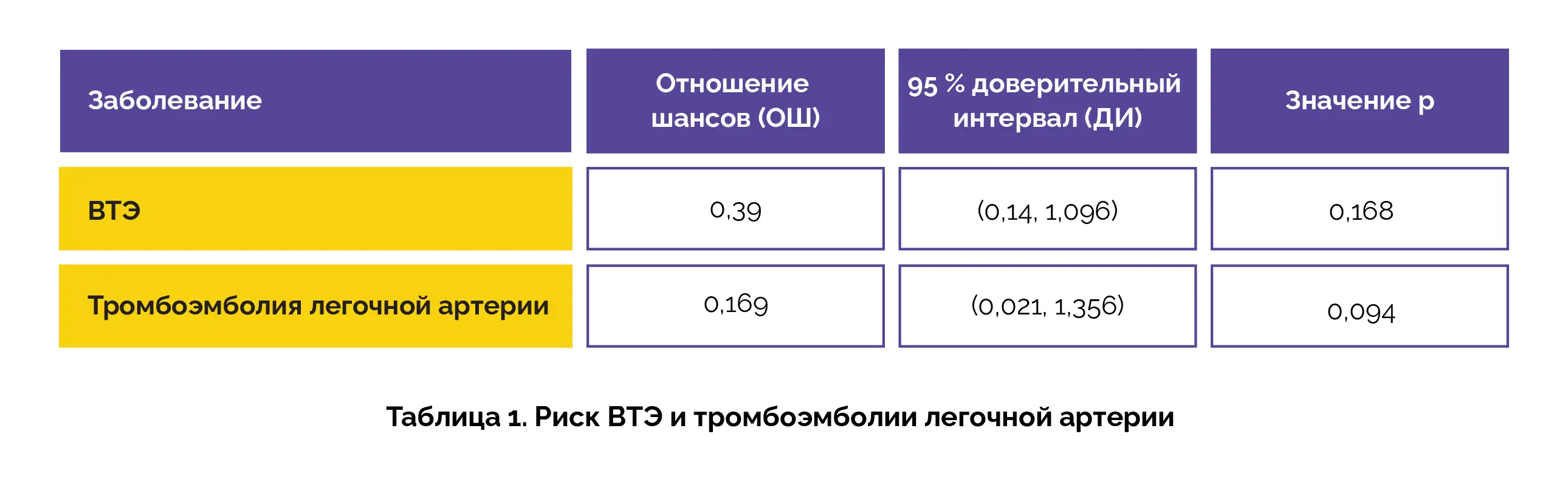 В целом были проанализированы данные 220 участников из двух исследований. По сравнению с пациентами, получавшими НМГ, пациенты, получавшие фондапаринукс, были менее склонны к развитию венозной тромбоэмболии (ВТЭ), тромбоэмболии легочной артерии и тромбоза глубоких вен (см. таблицу 1).