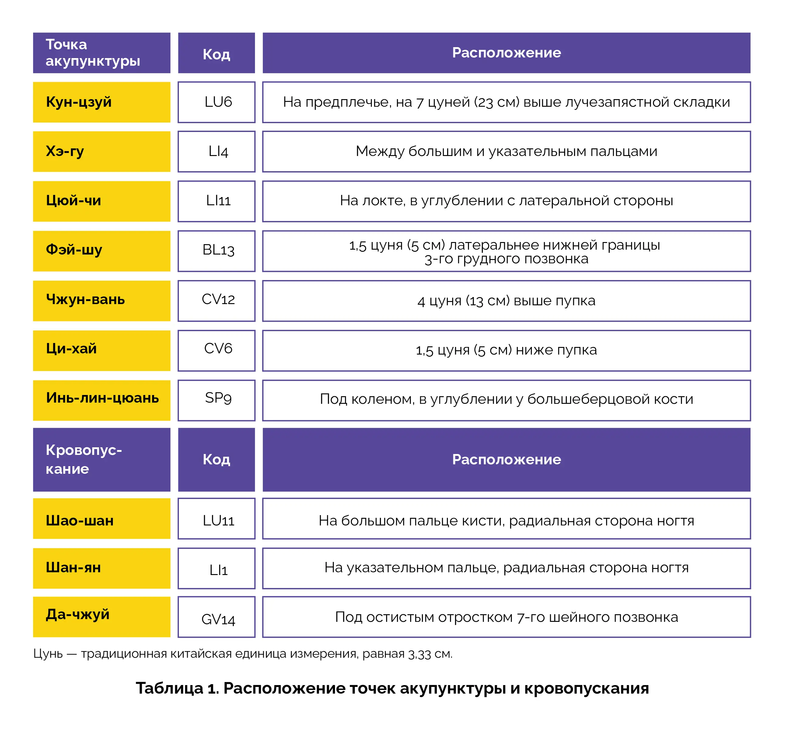 группу вмешательства: 50 пациентов проходили сеансы акупунктуры в комбинации с кровопусканием в дополнение к приему внутрь отвара Цинвэнь Сежэ, при этом сеансы акупунктуры проводили по 30 минут каждый день в течение 6 дней, а сеансы кровопускания проводили 3 раза через день. Подробная информация о расположении точек акупунктуры представлена в таблице 1.