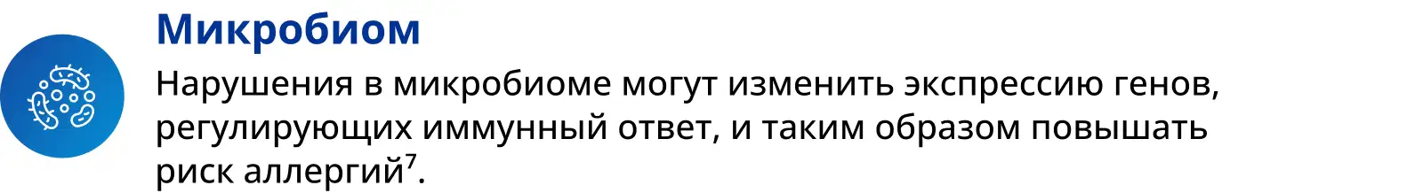 Известно, что вероятность развития атопии у ребенка, если оба родителя не страдают аллергией, составляет не более 10%. Если аллергия есть у одного из родителей, шанс увеличивается до 30-40%, а если оба родителя аллергики — до 50-70% [13]. Важно понимать, что наследуется не само заболевание, а предрасположенность к нему. Реализуется ли эта предрасположенность в виде болезни, во многом зависит от факторов окружающей среды, влияние которых далеко не второстепенно.