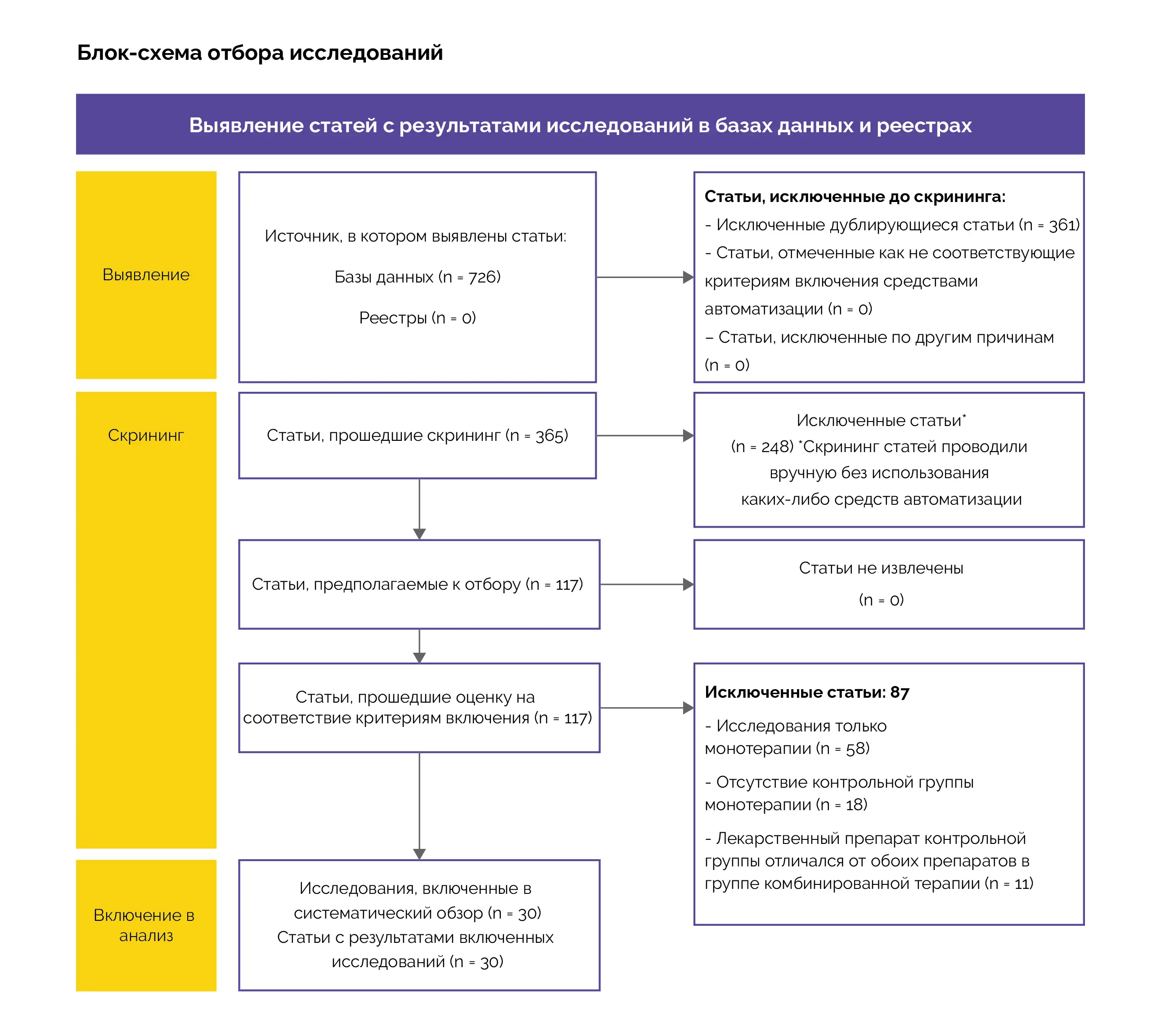 Два автора независимо друг от друга оценивали статьи путем скрининга аннотаций. Далее оба автора индивидуально изучили полнотекстовые статьи, чтобы определить их соответствие критериям включения, и извлекли соответствующие данные из квалификационных исследований. Извлеченная информация по каждому исследованию включала такие результаты, как нежелательные явления, частота успеха лечения, протокол лечения и количество участников. Любые недоступные данные были обозначены как «Н/Д».