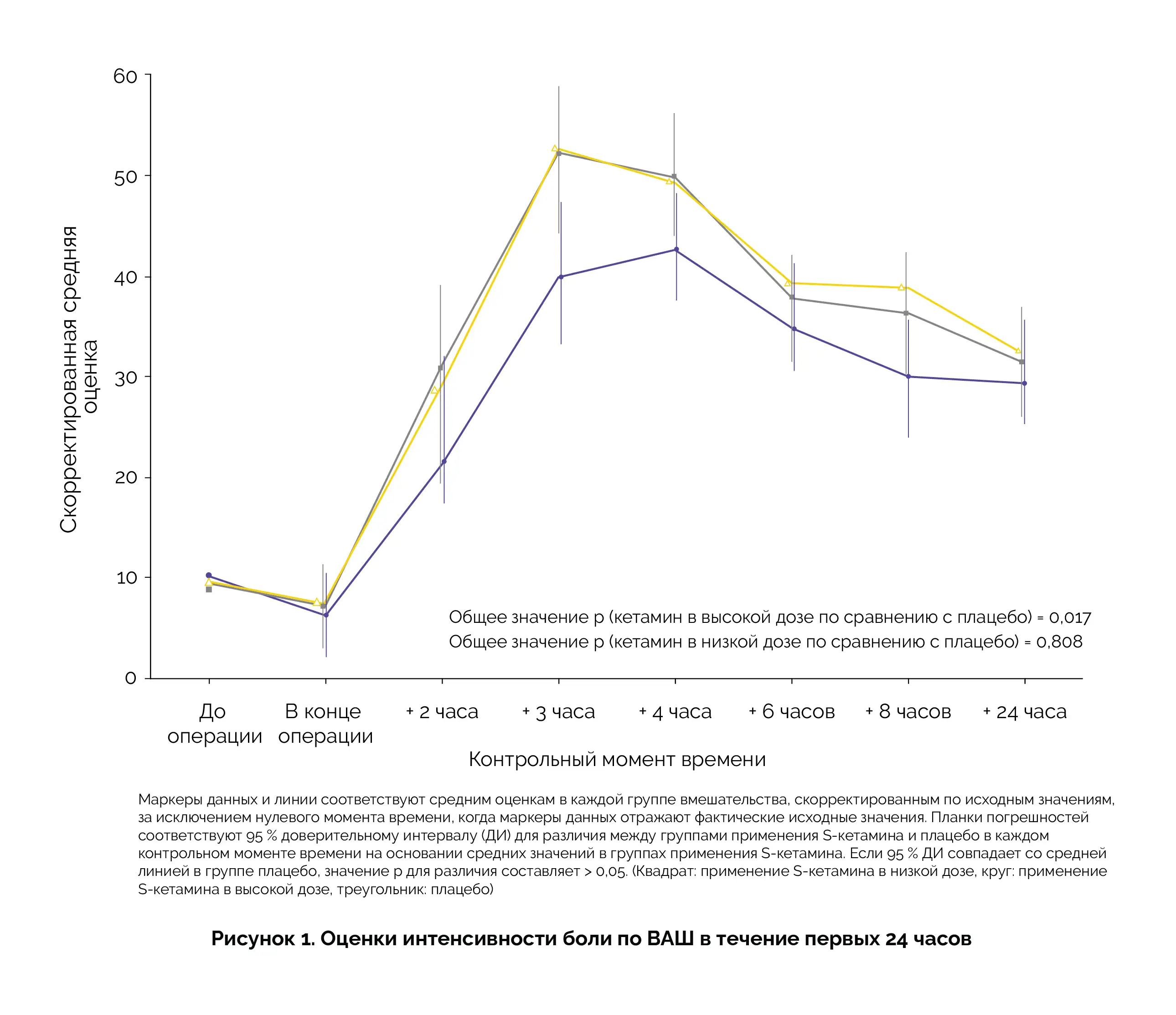 Статистически значимое различие в оценках по ВАШ через 4 часа после операции между группой плацебо и группами применения S-кетамина в высокой или низкой дозах отсутствовало. Однако в течение первых 24 часов наблюдалось заметное различие между группами; при этом в группе применения S-кетамина в высокой дозе оценка по ВАШ была ниже (см. рисунок 1).