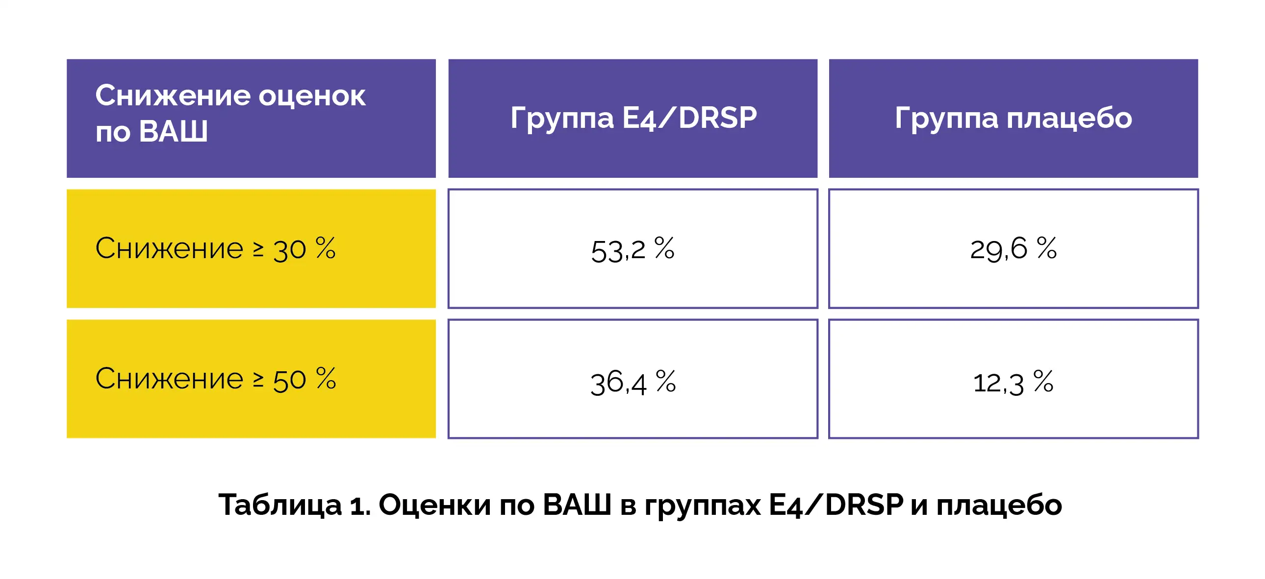 E4/DRSP эффективно облегчал боль и снижал выраженность симптомов эндометриоза. Также был установлен благоприятный профиль безопасности E4/DRSP, что делает его перспективным новым вариантом лечения с потенциально более низким риском явлений тромбоэмболии.