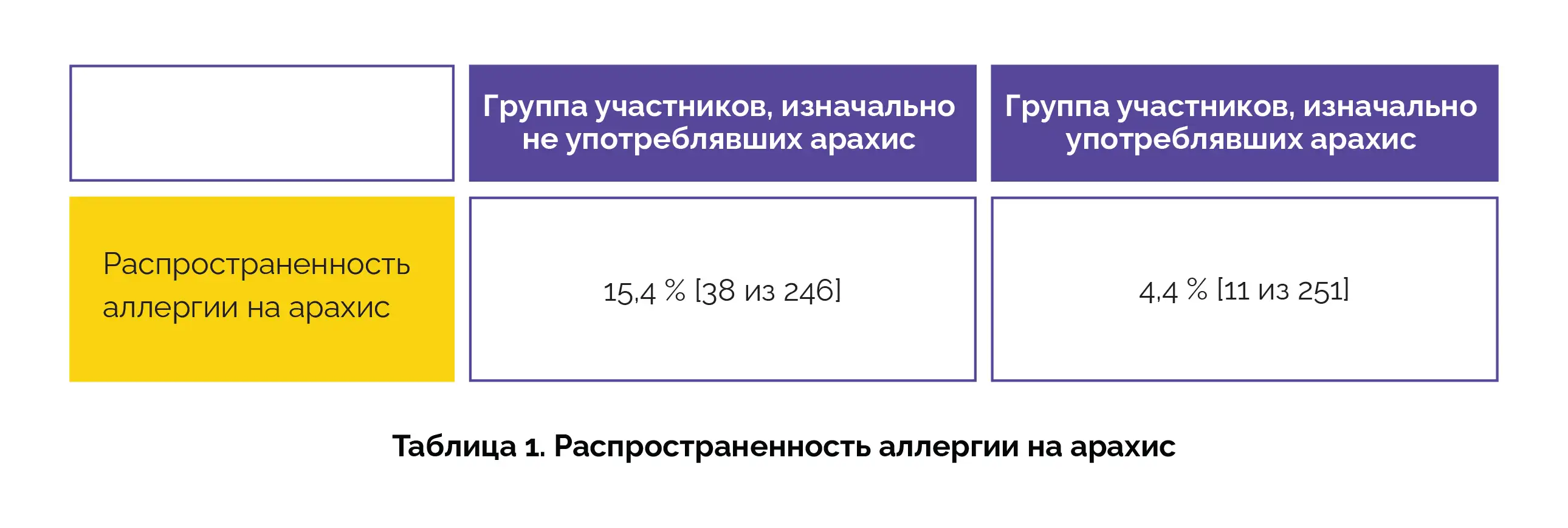 Из первоначально отобранных 640 добровольцев в исследование были включены 508 (79,4 %), при этом полные данные об основной конечной точке были получены у 497 добровольцев. Через 144 месяца распространенность аллергии на арахис в группе участников, изначально не употреблявших арахис, оставалась существенно выше, чем в группе участников, изначально употреблявших его (таблица 1).