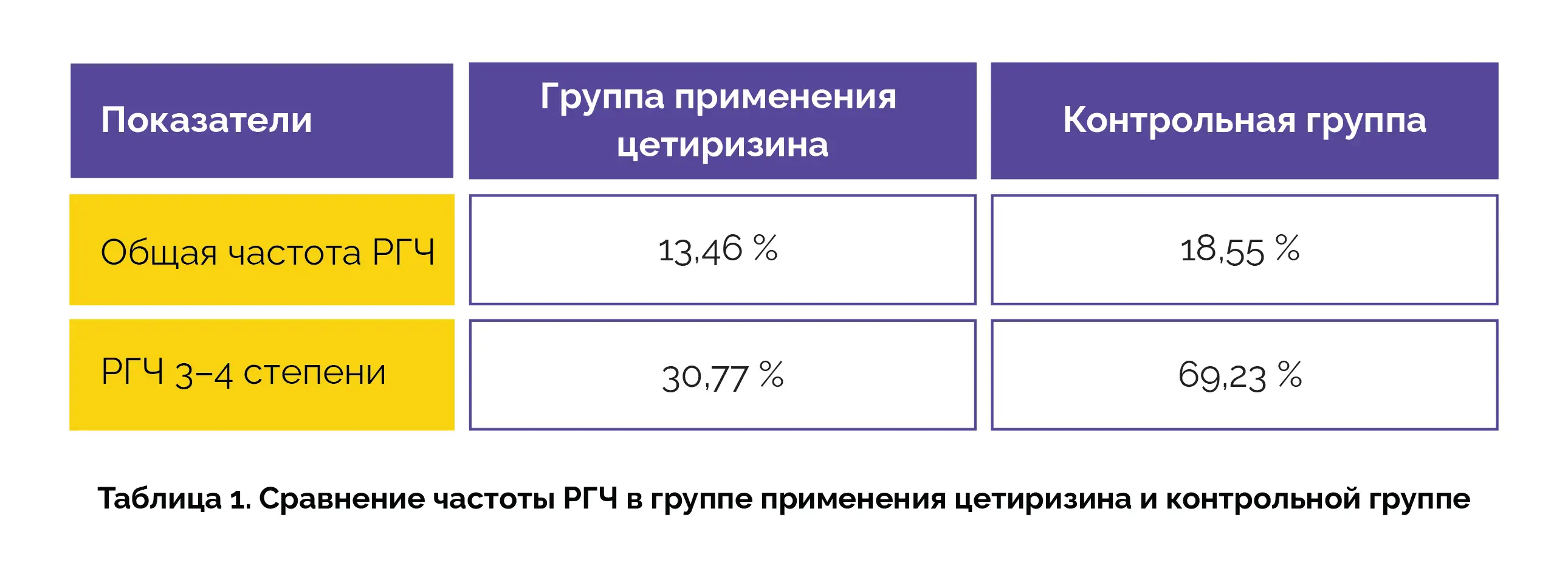 Схема премедикации, включающая высокие дозы цетиризина, была связана со снижением частоты РГЧ и снижением частоты РГЧ 3–4 степени на паклитаксел. Для полной оценки потенциала применения цетиризина в снижении частоты РГЧ на паклитаксел необходимы дальнейшие более крупномасштабные исследования с более эффективным контролем соблюдения режима лечения.