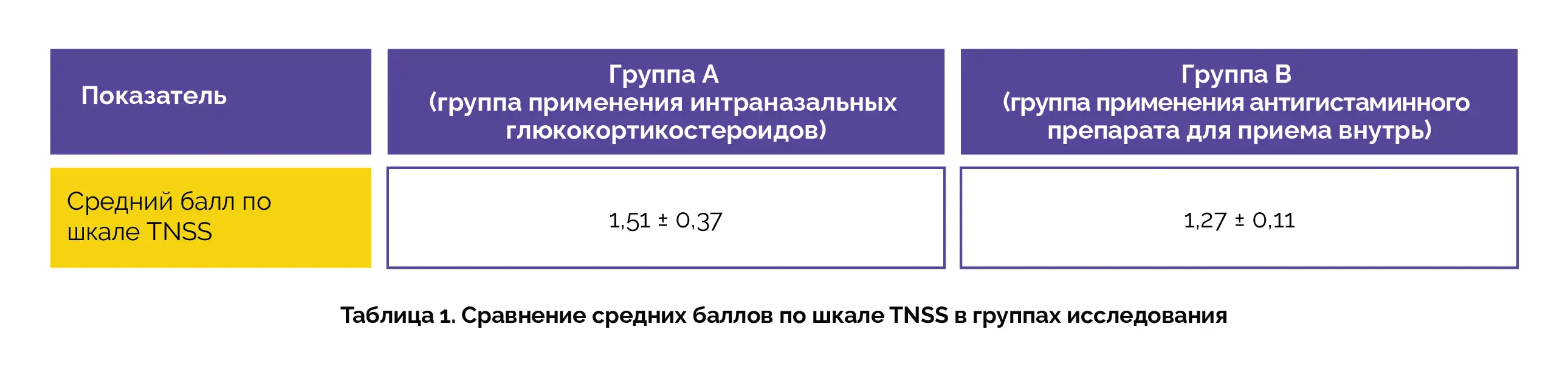 Средние баллы по шкале TNSS при применении ИнГКС и антигистаминных препаратов для приема внутрь приведены в таблице 1.
