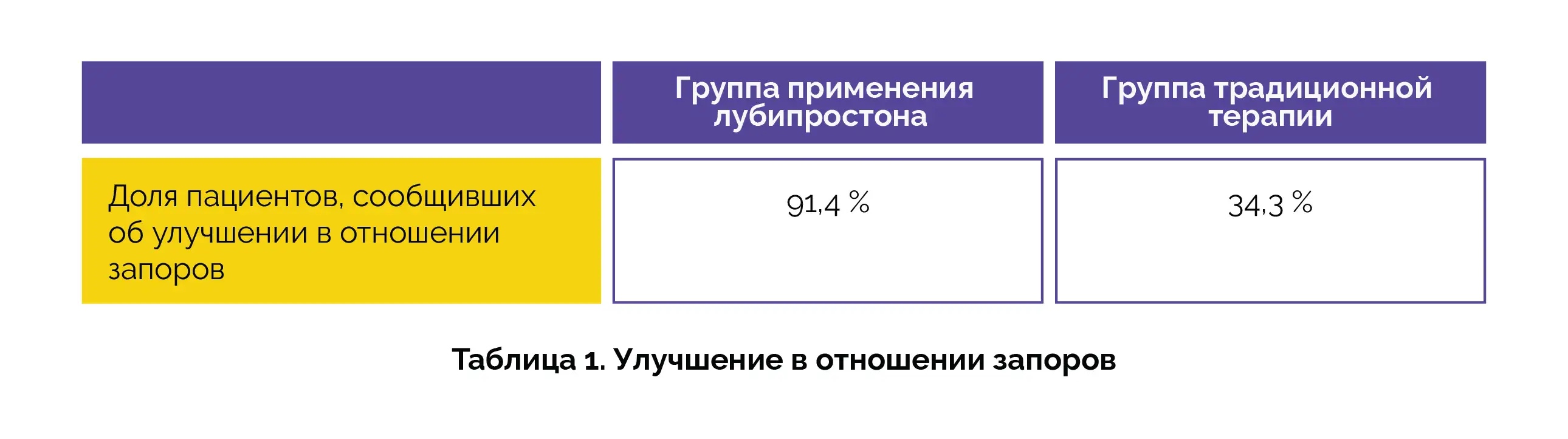 У пациентов в группе применения лубипростона наблюдались выраженные улучшения в отношении запоров у по сравнению с группой традиционной терапии (p < 0,001) (см. таблицу 1).