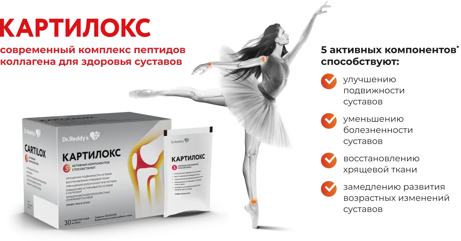 * В состав Картилокса входят в том числе: пептиды коллагена, куркумин, экстракт Босвеллии пильчатой, гиалуроновая кислота, экстракт черного перца.
