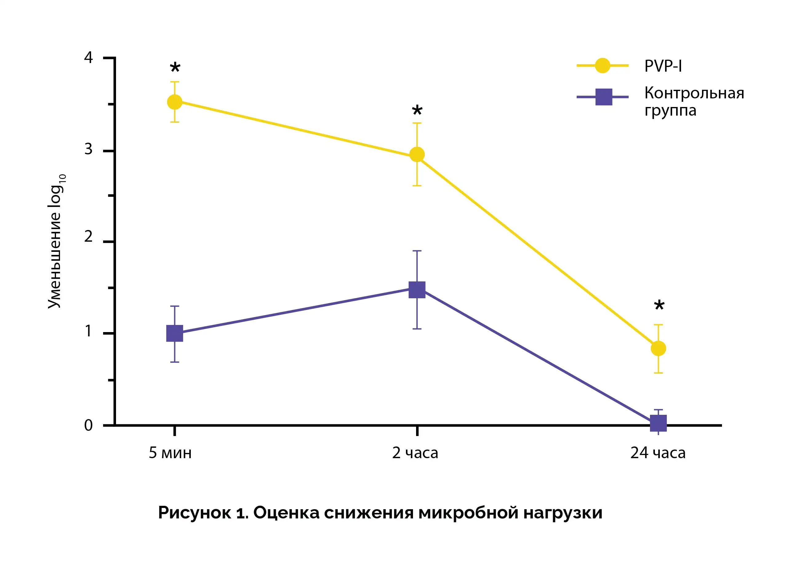 На исходном уровне наблюдалась выраженная корреляция между анаэробными видами бактерий, Dolosigranulum species, Corynebacterium и Staphylococcus. После нанесения раствора PVP-I отмечалось значимое снижение микробной нагрузки: log103,538 ± 0,918 через 5 минут; log10 2,961 ± 1,466 через 2 часа и log10 0,849 ± 1,092 через 24 часа (p < 0,01) (см. рисунок 1).