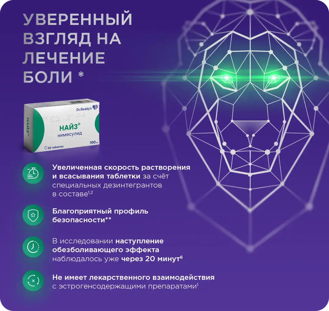 *Найз® 100 мг зарегистрирован в РФ 19.08.1998г. РУ NoП N 012824/03 и является лидером по продажам в упаковках среди нимесулидов для перорального приема, IQVIA январь-октябрь 2023, Россия; H. G. Kress, A. Baltov, A. Basiński, F. Berghea, J. Castellsague, C. Codreanu, E. Copaciu, M. A. Giamberardino, M. Hakl, L. Hrazdira, M. Kokavec, J. Lejčko, L. Nachtnebl, R. Stančík, A. Švec, T. Tóth, M. V. Vlaskovska и J. Woroń (2016). Acute pain: a multifaceted challenge - the role of nimesulide. Current Medical Research and Opinion, 2016, 32(1), 23-36. DOI: 10.1185/03007995.2015.1100986.