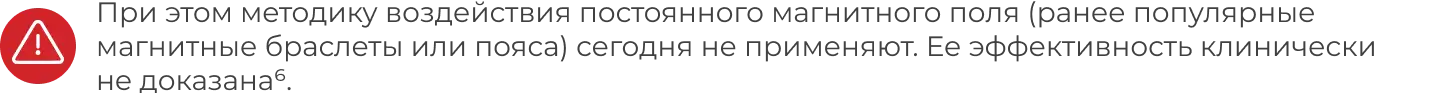 В основе действия магнитотерапии (МТ) на суставы лежат первичные физико-химические процессы, связанные с изменением конформации и ориентации макромолекул, скорости протекания биохимических реакций и гидратации ионов, структуры воды, повышением активности металлосодержащих ферментов и др⁶. Современные портативные и стационарные приборы с воздействием импульсным магнитным полем (ИМП) показали положительную динамику клинической симптоматики при артрозах, согласно опроснику EQ-5D, а также уменьшение объема суставов по сравнению с показателями у пациентов, получавших плацебо-воздействие. Низкочастотная МТ в течение 6 недель вызывала более существенную динамику клинических показателей по шкалам WOMAC и EQ-5D в отличие от группы плацебо: метод обладает обезболивающим эффектом, улучшает подвижность суставов и стимулирует микроциркуляцию⁶.