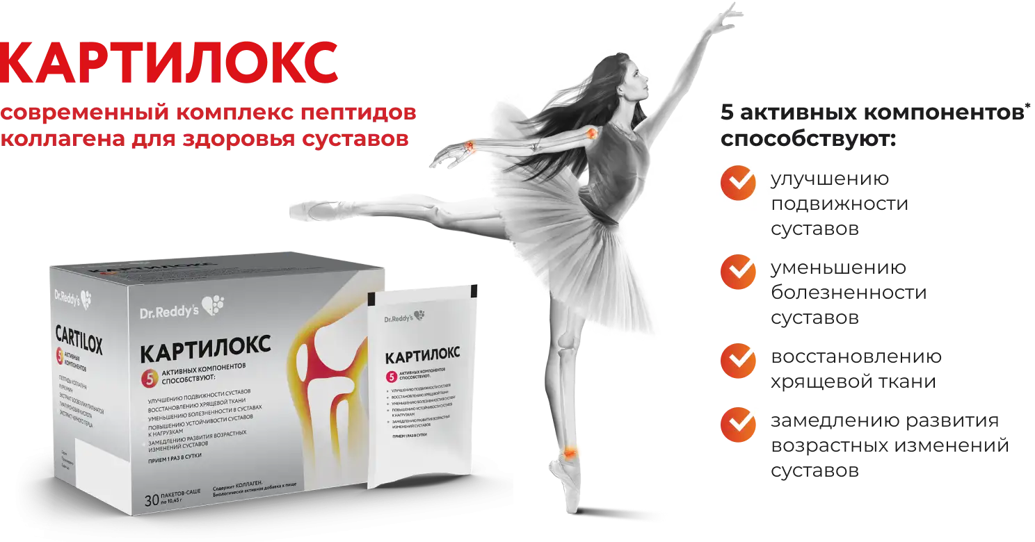 * В состав Картилокса входят в том числе: пептиды коллагена, куркумин, экстракт Босвеллии пильчатой, гиалуроновая кислота, экстракт черного перца.