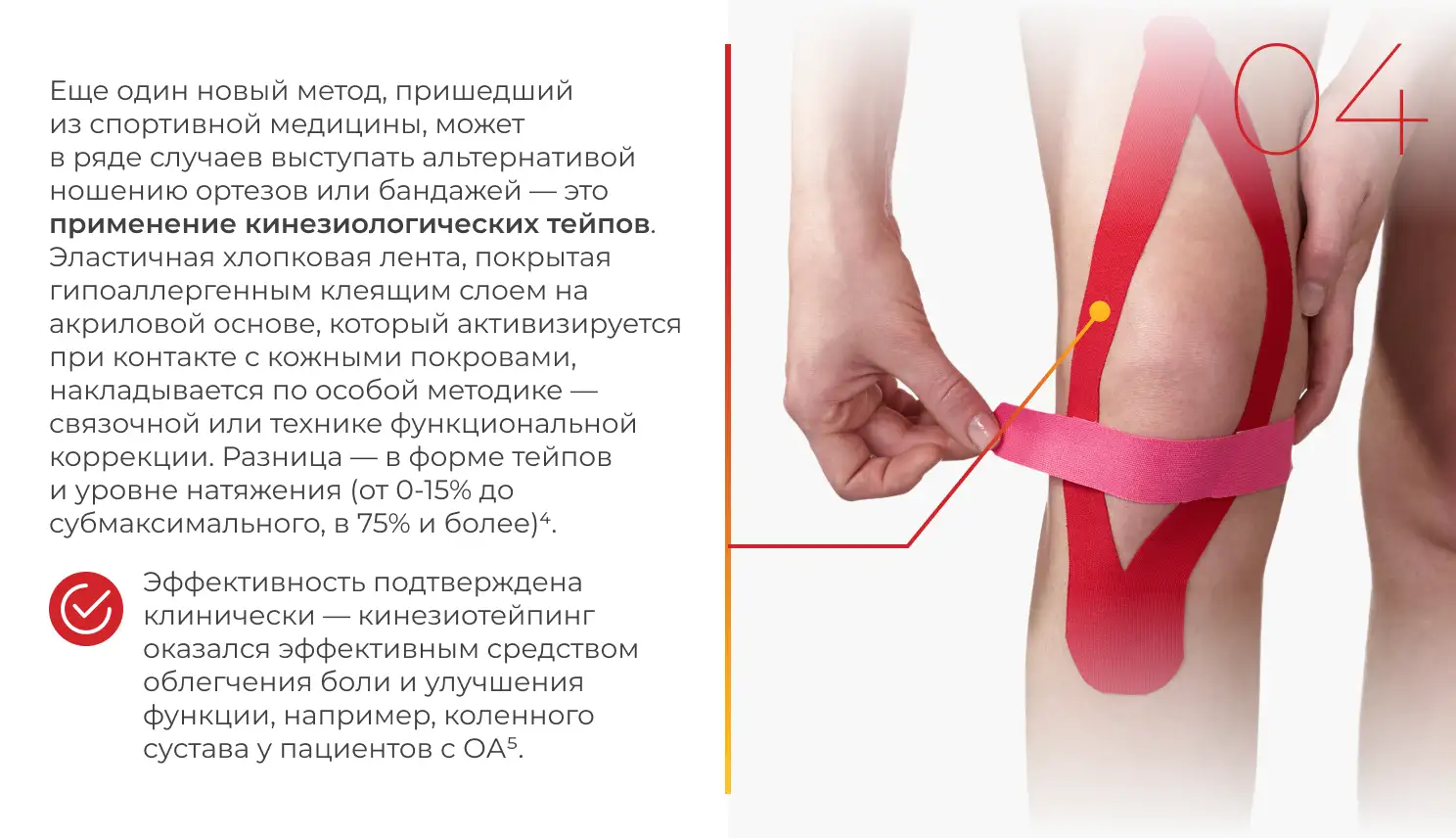 5. Lu Z., Li X., Chen R., Guo C. Kinesio taping improves pain and function in patients with knee osteoarthritis: A meta-analysis of randomized controlled trials. Int J Surg. 2018 Nov; 59:27-35. doi: 10.1016/j.ijsu.2018.09.015. Epub 2018 Sep 28. PMID: 30273684.