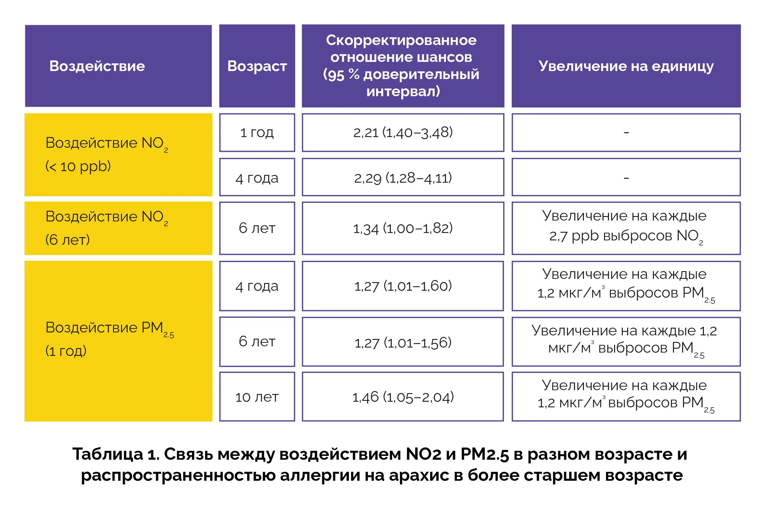 Воздействие повышенного уровня NO2 (менее 10 частей на миллиард [ppb]) в возрасте 1 года было связано с увеличением частоты развития аллергии на арахис в возрасте 1 года и 4 лет. Повышенное воздействие NO2 в возрасте 6 лет приводило к более высокой распространенности аллергии на арахис в возрасте 6 лет. Аналогичным образом, более высокое воздействие PM2.5 в возрасте 1 года было связано с аллергией на арахис в ранние годы жизни (в возрасте 4, 6 и 10 лет) (таблица 1).
