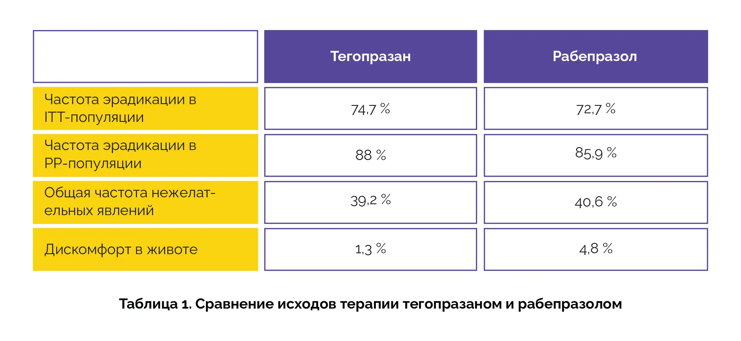При анализе популяции с назначенным лечением (ITT) и популяции без отклонений от протокола (PP) частота эрадикации при лечении тегопразаном и рабепразолом были практически аналогичными. Совокупная частота нежелательных явлений была сопоставима между группами. Однако частота дискомфорта в животе была значимо ниже в группе применения тегопразана (см. таблицу 1).