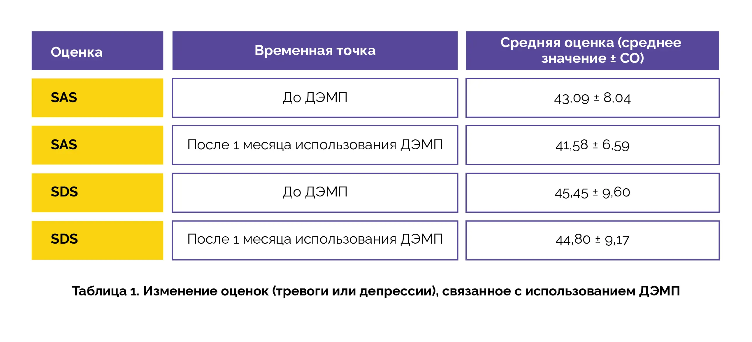 Средние оценки по шкале самооценки тревоги (SAS) и шкале самооценки депрессии (SDS) до и после одного месяца использования ДЭМП у 760 беременных женщин, прошедших оценку, представлены в таблице 1.