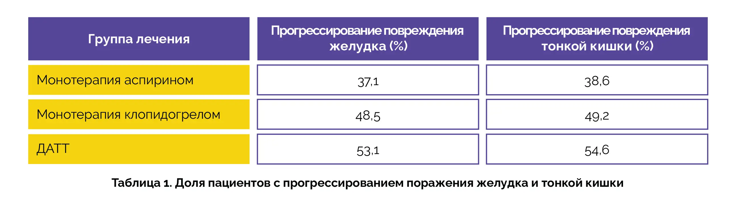 Продолжение приема аспирина, клопидогрела или их комбинации в течение 6–12 месяцев после ЧКВ было связано со значимой частотой прогрессирования поражения желудка и тонкой кишки у значительного числа участников, особенно при использовании ДАТТ по сравнению с монотерапией. Более того, вероятность прогрессирования повреждений желудочно-кишечного тракта при приеме клопидогрела, по крайней мере, сопоставима с таковой при приеме аспирина.