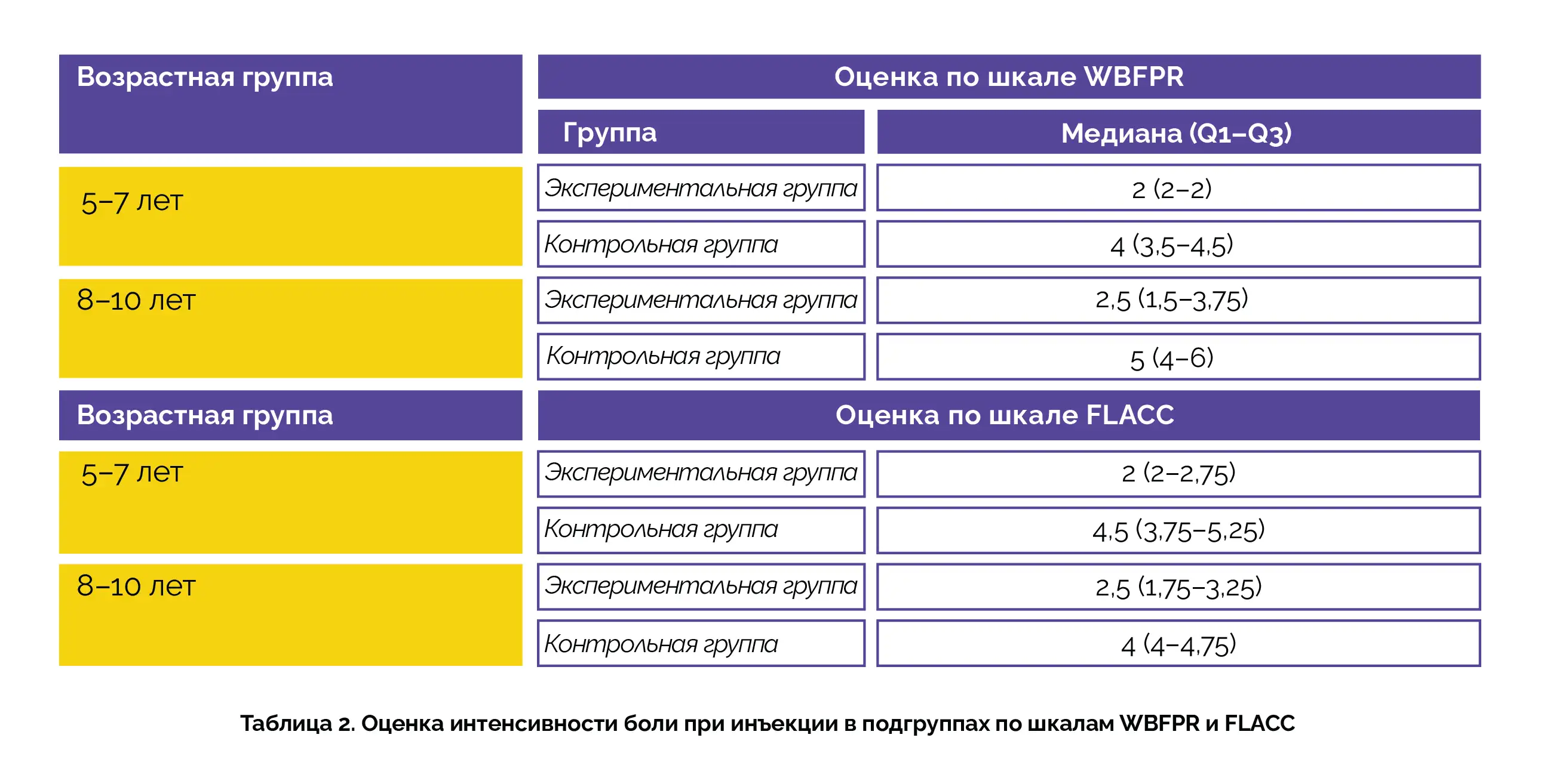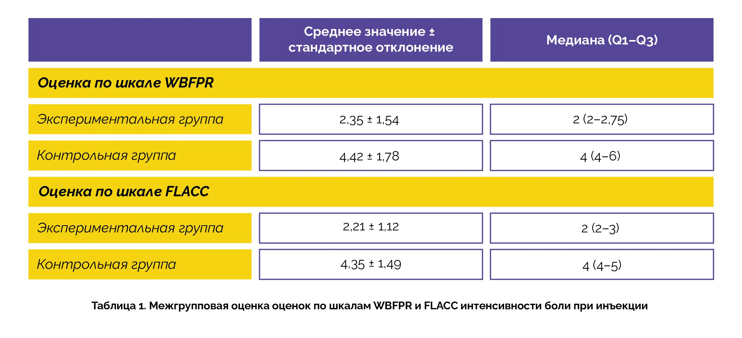 В этом рандомизированном клиническом исследовании статистически значимое снижение интенсивности боли при инъекции, подтвержденное как объективными, так и субъективными оценками, наблюдалось в группе применения прибора для термомеханической стимуляции с аудиоотвлечением. Результаты межгруппового анализа интенсивности боли при инъекции, проведенного с использованием шкал WBFPR и FLACC, свидетельствуют о статистически значимо меньшей интенсивности боли в экспериментальной группе (см. таблицу 1).
