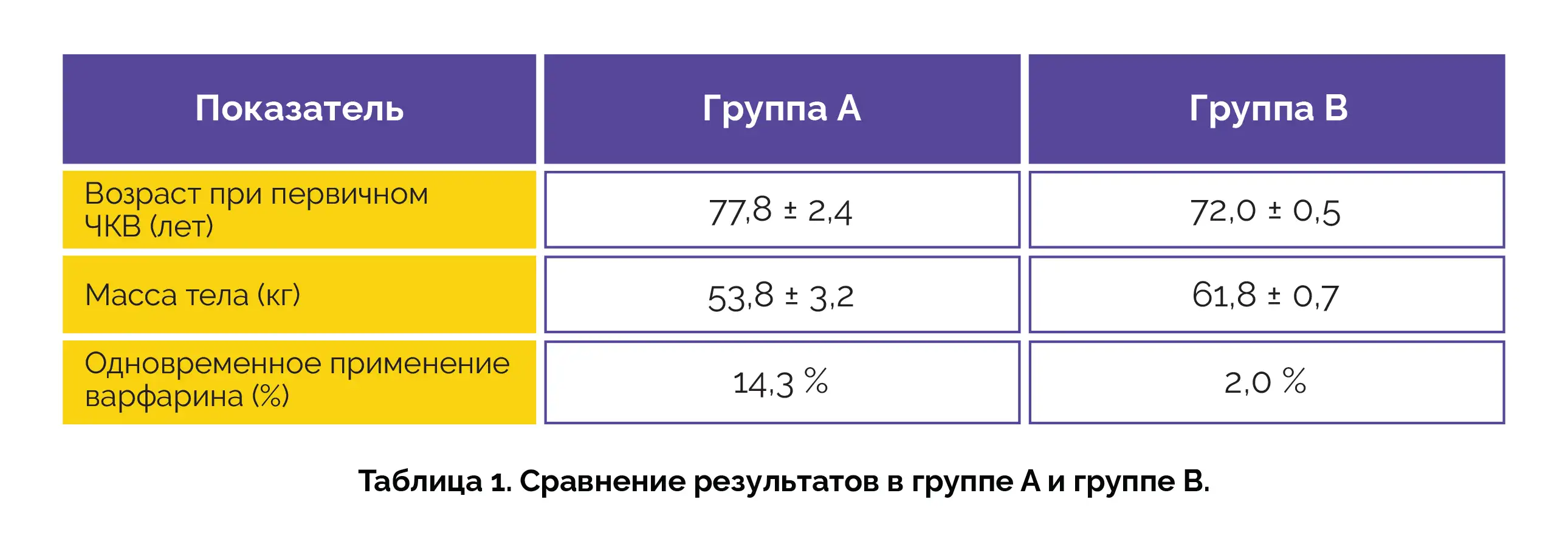 Статистически значимые различия в показателях у пациентов групп А и В (таблица 1).