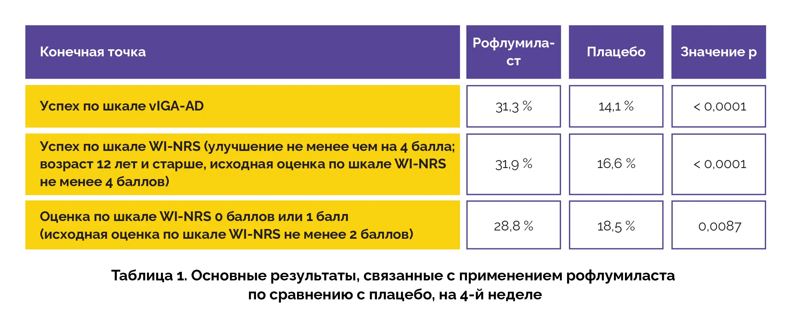 На 4-й неделе более высокая доля пациентов, получавших рофлумиласт, достигла успеха по шкале vIGA-AD, успеха по шкале WI-NRS и оценки по шкале WI-NRS 0 баллов или 1 балл по сравнению с пациентами, получавшими плацебо (см. таблицу 1).