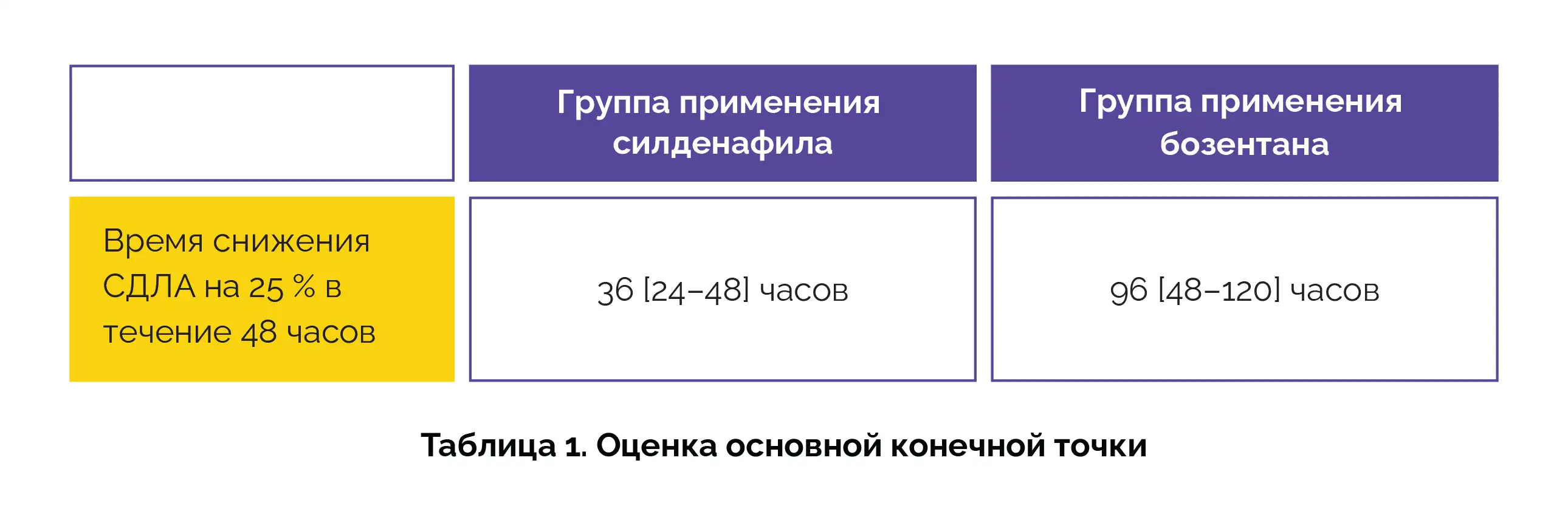 В анализ были включены в общей сложности 36 новорожденных (по 18 в каждую группу). Начальные уровни СДЛА в исследуемых группах были сопоставимы. В группе применения силденафила медиана (межквартильный размах) времени достижения основной конечной точки, определяемой как снижение СДЛА на 25 % в течение 48 часов, была существенно меньше, чем в группе применения бозентана (таблица 1).