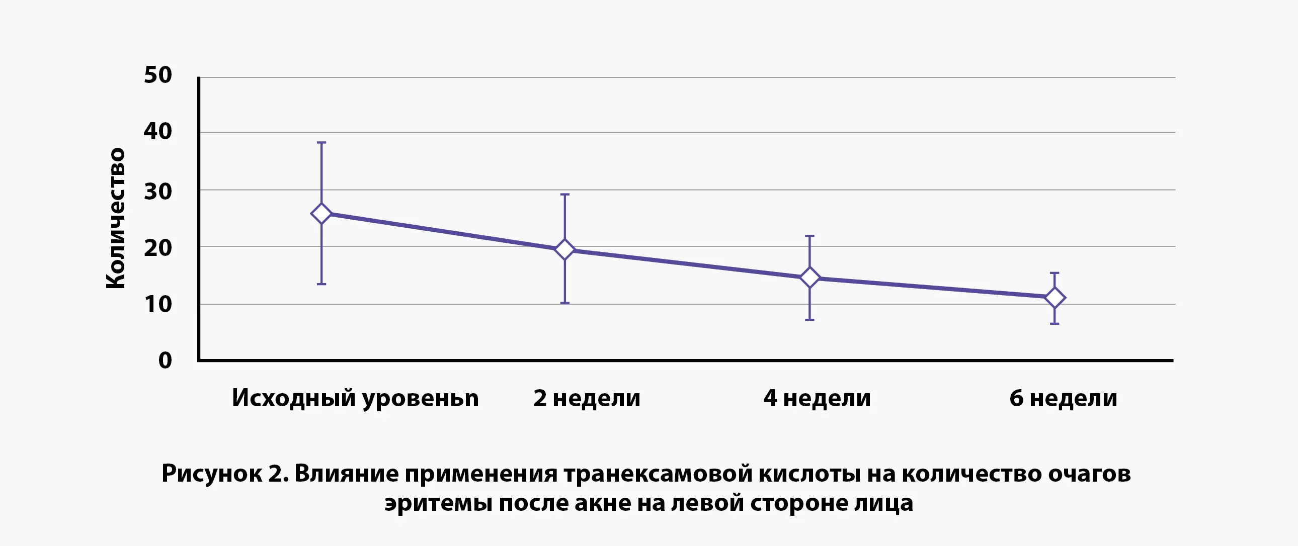После применения обоих методов лечения наблюдалось значительное сокращение количества очагов поражения и снижение степени тяжести эритемы после акне по сравнению с состоянием на момент начала этой терапии (рисунок 1 и рисунок 2).