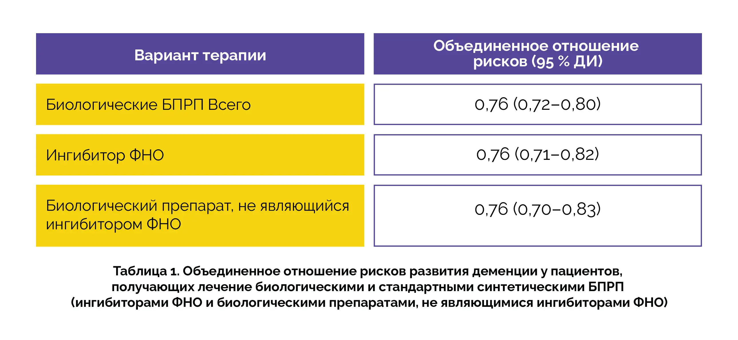 Установлено, что таргетная терапия базисными противоревматическими препаратами (БПРП) на 30 % снижала риск развития деменции и потенциально может рассматриваться как способ профилактики деменции у пациентов с ревматоидным артритом и высоким соответствующим риском.